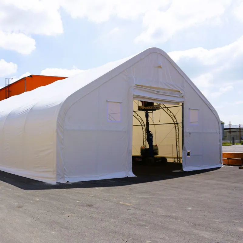 Højden i toppen af teltet er 6,4 m, hvilket gør det muligt at opbevare selv store genstande og maskiner og giver også frihed til at manøvrere køretøjer inde i teltet. Den brede 4x4 m dør, der betjenes med et spil, gør det nemt at komme ind og ud, hvilket er særligt nyttigt i travle områder som f.eks. byggepladser eller logistiklagre.