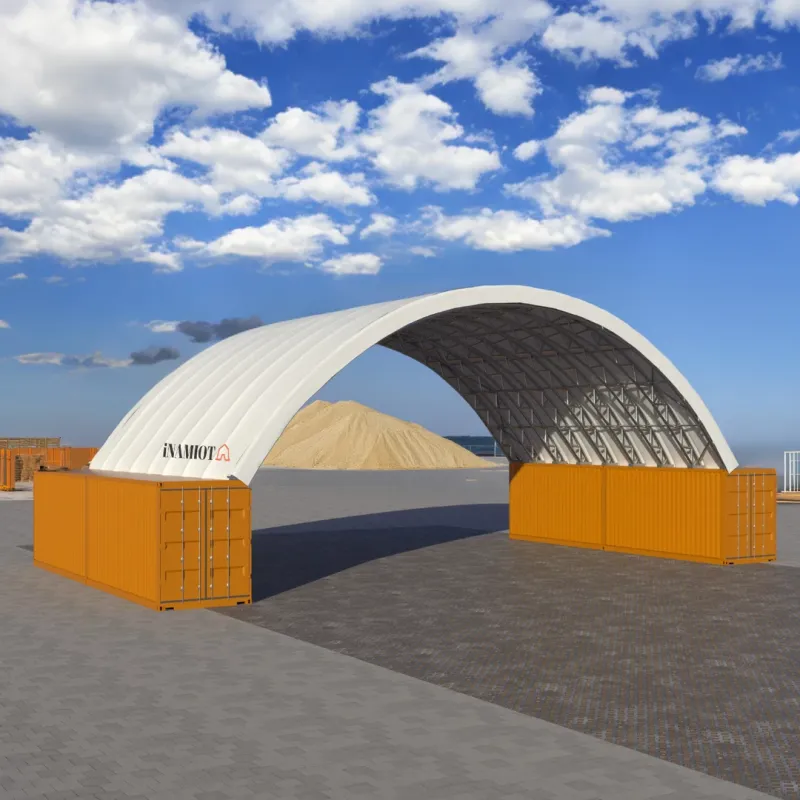 One of the key advantages of this canopy is its installation on the inner edges of shipping containers or concrete blocks. The peak height of 5.0 m provides freedom of movement for large vehicles such as excavators, buses or trucks.