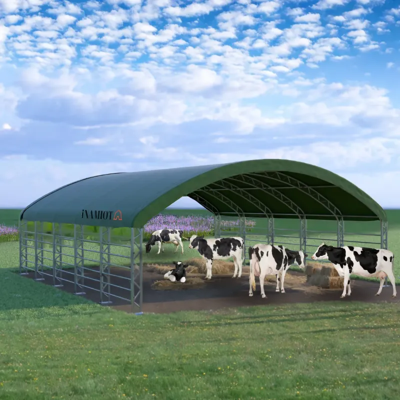 Chov kráv na pastve, či už na mlieko alebo na hovädzí dobytok, je v modernom poľnohospodárstve čoraz dôležitejší. Preto sme v snahe splniť požiadavky našich zákazníkov vyvinuli ohradu pre zvieratá s ľahkou konštrukciou, ktorá poskytuje úkryt pred dažďom a slnečným žiarením počas pasenia na lúke. Vďaka krytej ploche, do ktorej má dobytok voľný prístup, je napájanie a kŕmenie zvierat jednoduchšie. Plocha s rozlohou 144 m2 pod strechou z pevnej PVC plachty a odretými bočnými stenami poskytuje dobytku oddych počas horúcich dní a úkryt pred dažďom.
