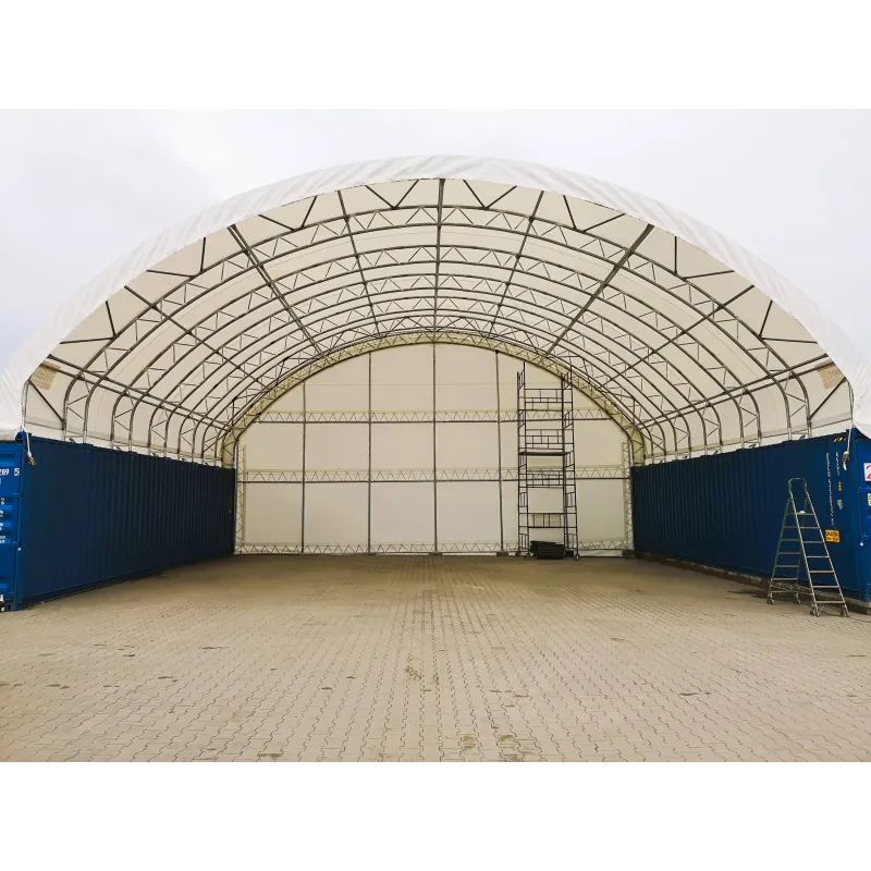 Containertältet GS4640C 14,92×12,19 m är en extremt ekonomisk lösning för förvaring av varor, fordon och maskiner året runt i dåligt väder. Den hållbara konstruktionen av containertältet GS4640C 14,92×12,19 m baseras på en dubbel takstol av högkvalitativt varmförzinkat stål, vilket garanterar lång livslängd och robusthet. Tack vare sin väderbeständighet står containertaket GS4640C 14,92×12,19 m emot regn, snö, vindhastigheter på upp till 80 km/h och UV-strålar, vilket gör det perfekt för användning året runt. Takpresenningen på 750 g eller 900 g är inte bara vattentät utan också brandsäker, vilket gör den säkrare att använda. Med enkel montering och demontering som inte kräver bygglov erbjuder containertaket GS4640C 14,92×12,19 m bekvämt och flexibelt förvaringsutrymme som snabbt kan anpassas till förändrade behov.